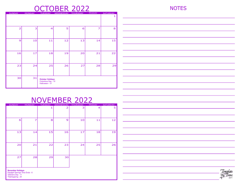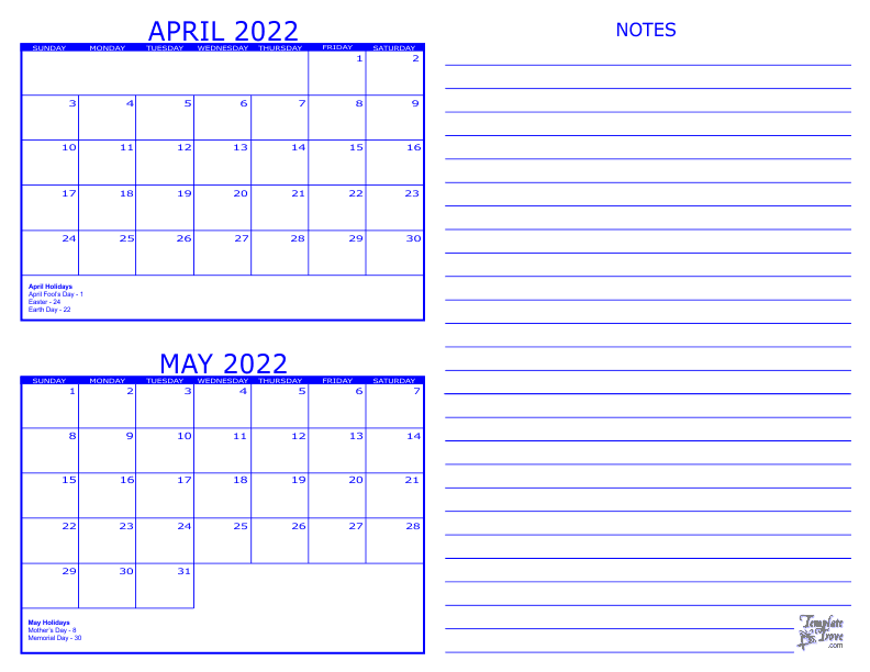 2 month calendars are available in PDF format. Five colors to choose from and can be printed on standard letter size paper (8 1/2" x 11") in landscape orientation. 2 calendar months on each page with a notes section for each month.