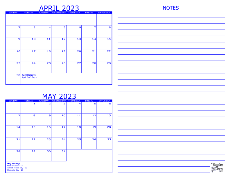 2023 2 Month Calendar - April and May