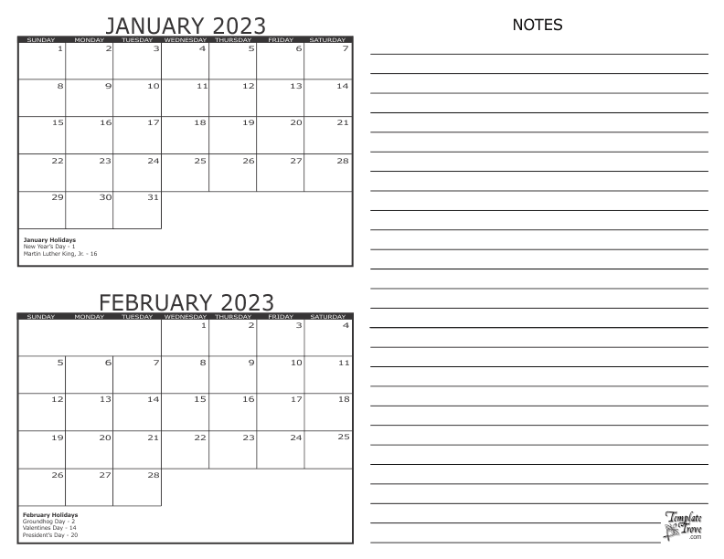 2023 2 Month Calendars