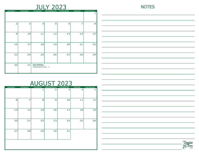 July and August 2023 2 Month Calendar