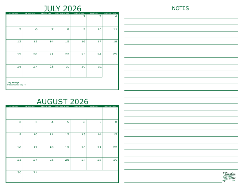 2 month calendars are available in PDF format. Five colors to choose from and can be printed on standard letter size paper (8 1/2" x 11") in landscape orientation. 2 calendar months on each page with a notes section for each month.