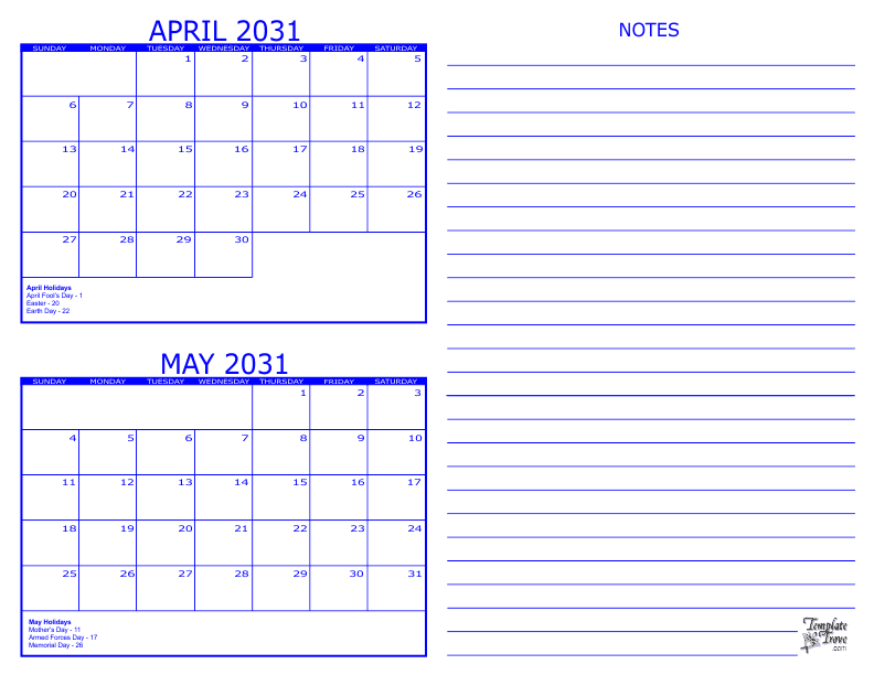 2031 2 Month Calendar - April and May