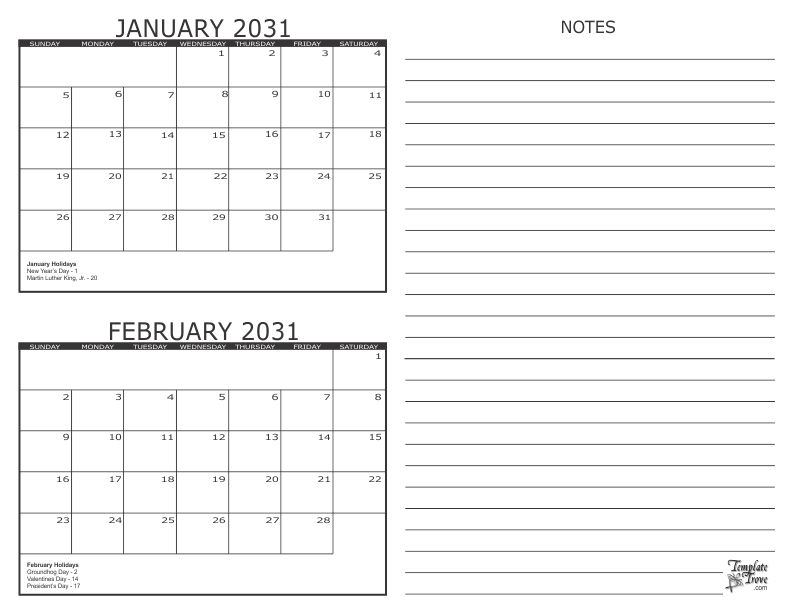 2031 2 Month Calendars
