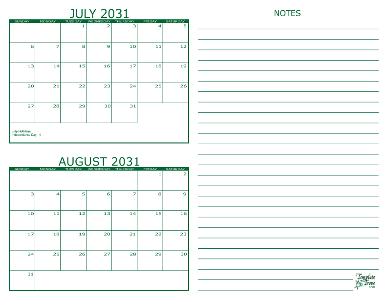 July and August 2031 2 Month Calendar