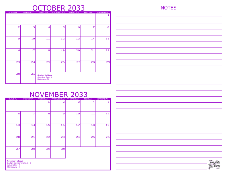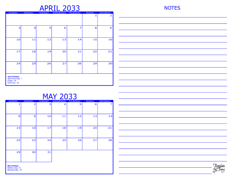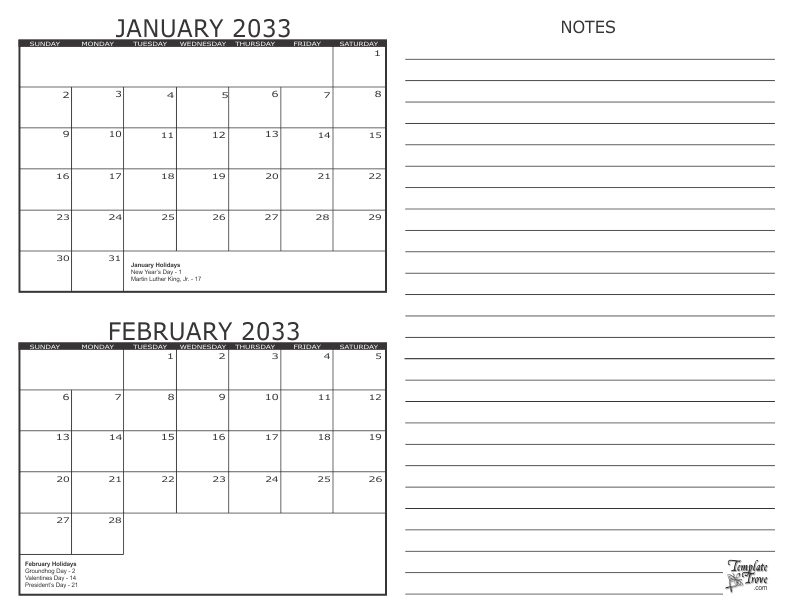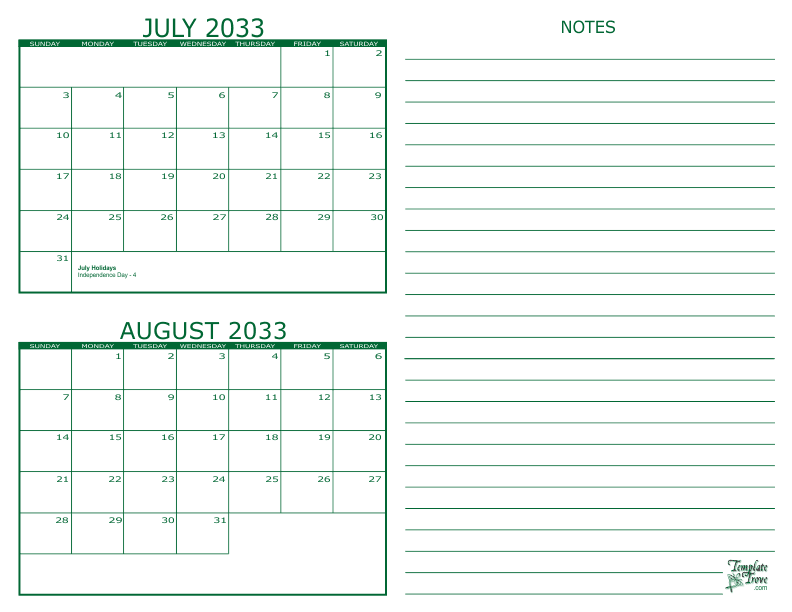 2 month calendars are available in PDF format. Five colors to choose from and can be printed on standard letter size paper (8 1/2" x 11") in landscape orientation. 2 calendar months on each page with a notes section for each month.