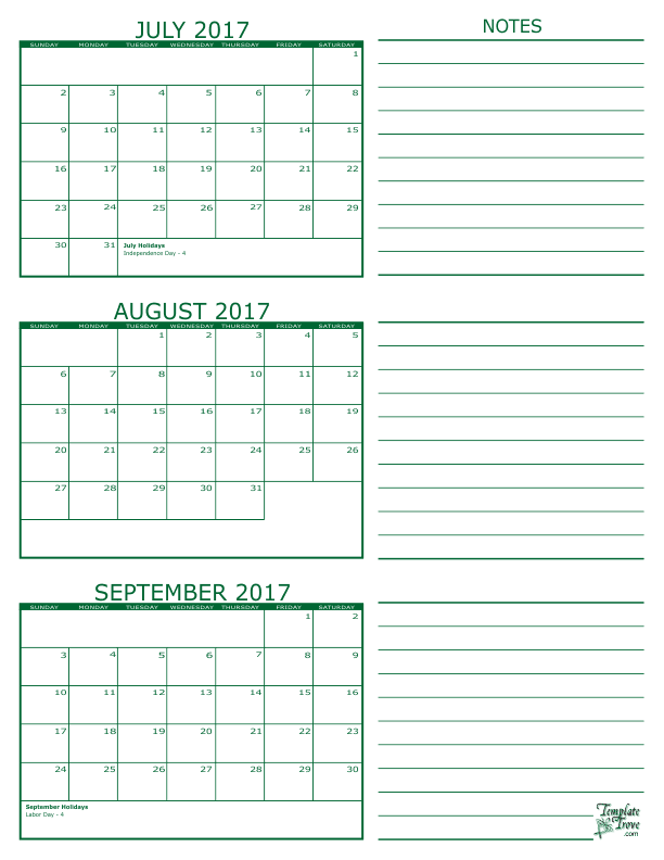 3 Month Calendar - July, August and September