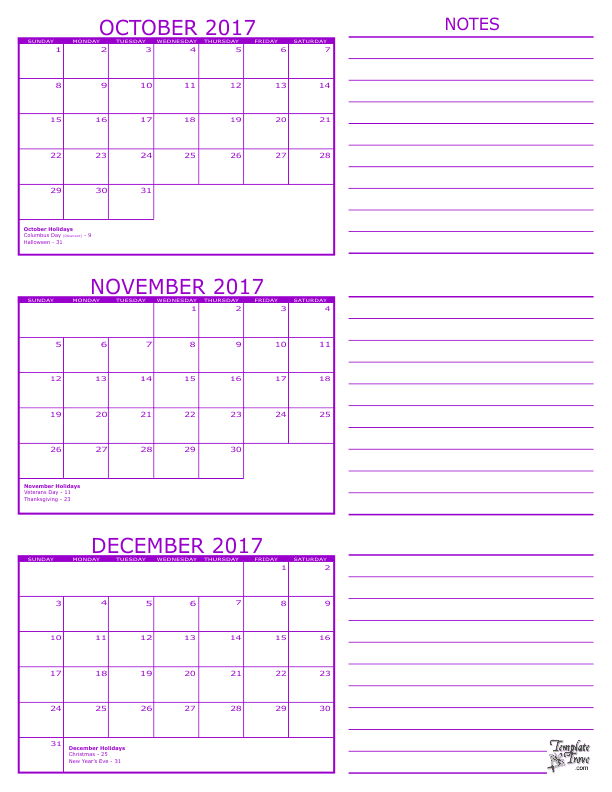 3 Month Calendar - October, November and December