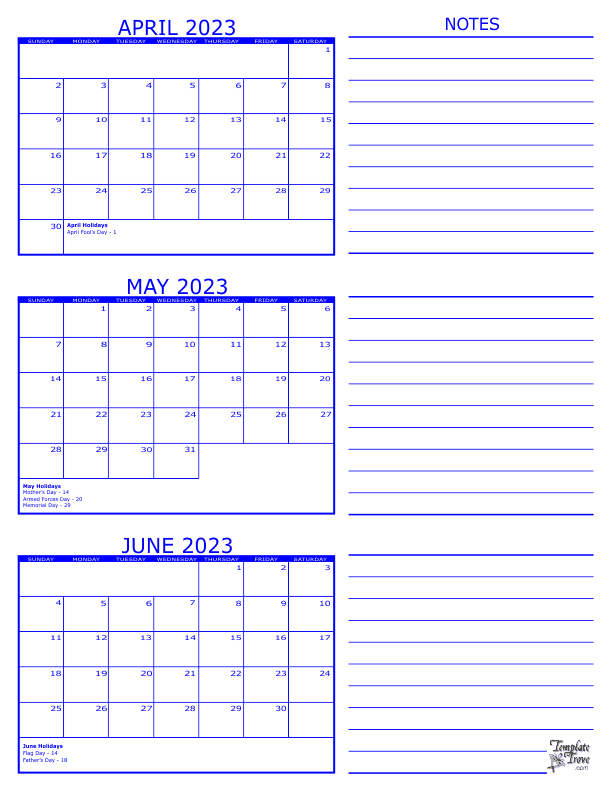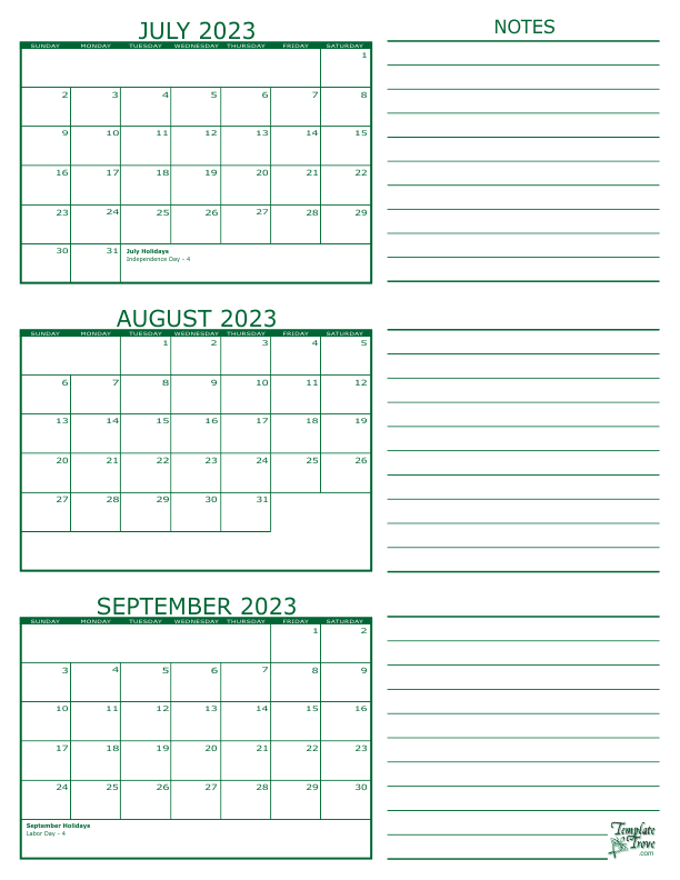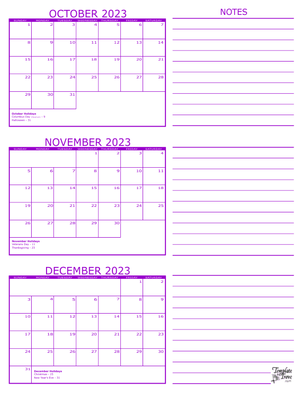 3 month calendars are available in PDF format. Five colors to choose from and can be printed on standard letter size paper (8 1/2" x 11"). 3 calendar months on each page with a notes section for each month.