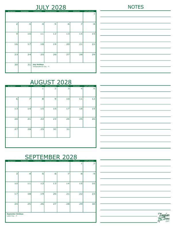 3 month calendars are available in PDF format. Five colors to choose from and can be printed on standard letter size paper (8 1/2" x 11"). 3 calendar months on each page with a notes section for each month.