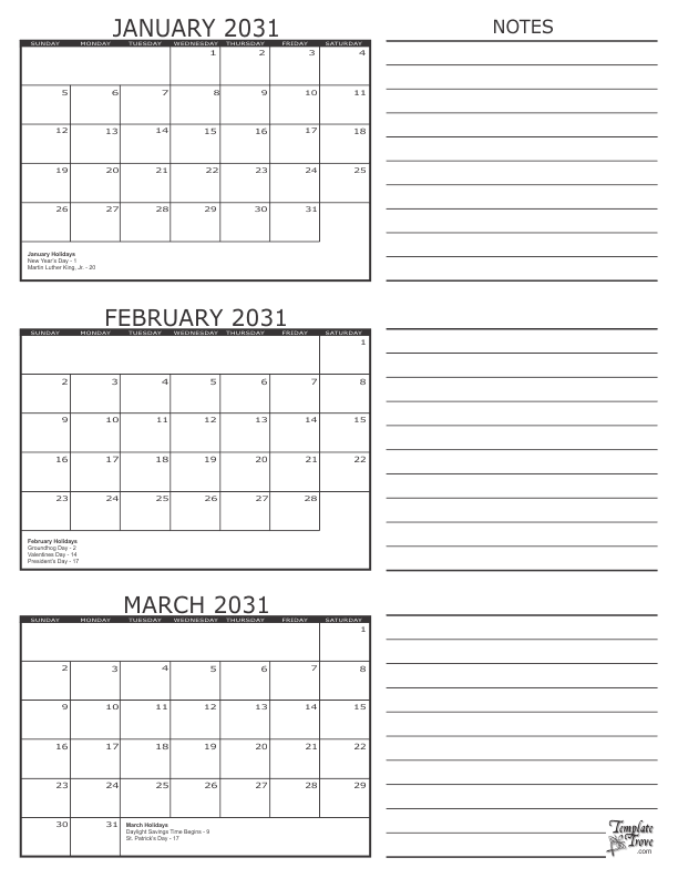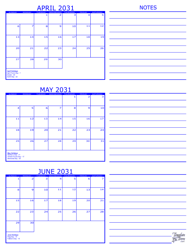 3 month calendars are available in PDF format. Five colors to choose from and can be printed on standard letter size paper (8 1/2" x 11"). 3 calendar months on each page with a notes section for each month.