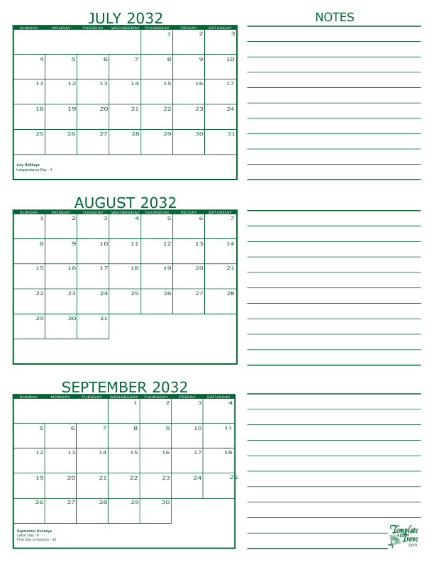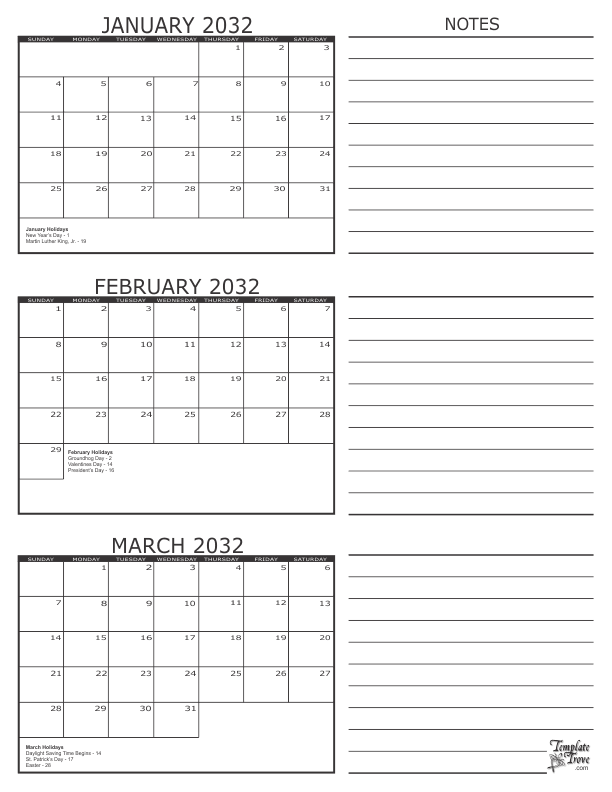 3 month calendars are available in PDF format. Five colors to choose from and can be printed on standard letter size paper (8 1/2" x 11"). 3 calendar months on each page with a notes section for each month.