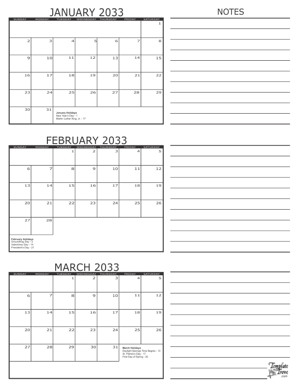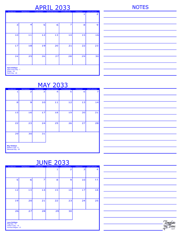 3 month calendars are available in PDF format. Five colors to choose from and can be printed on standard letter size paper (8 1/2" x 11"). 3 calendar months on each page with a notes section for each month.