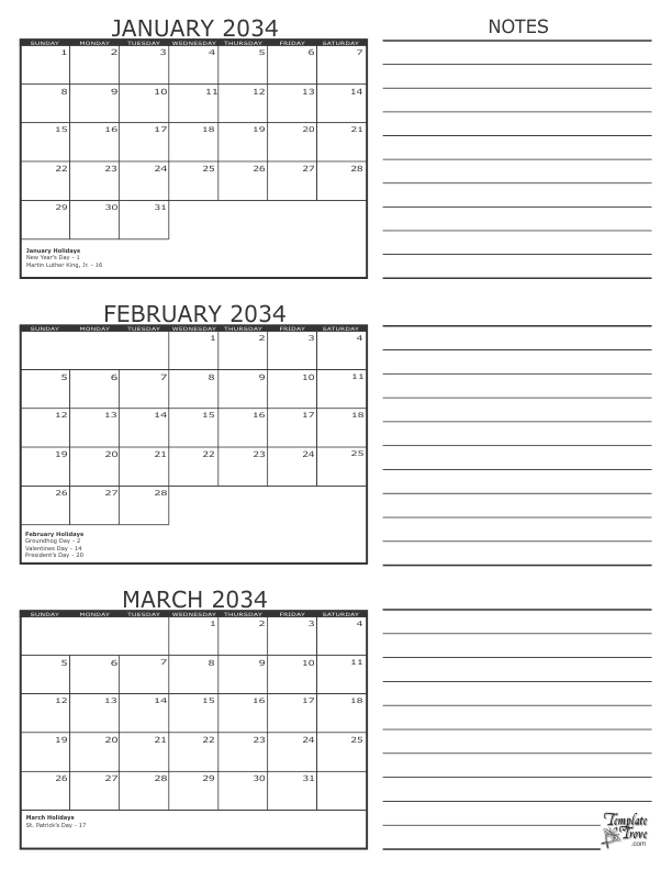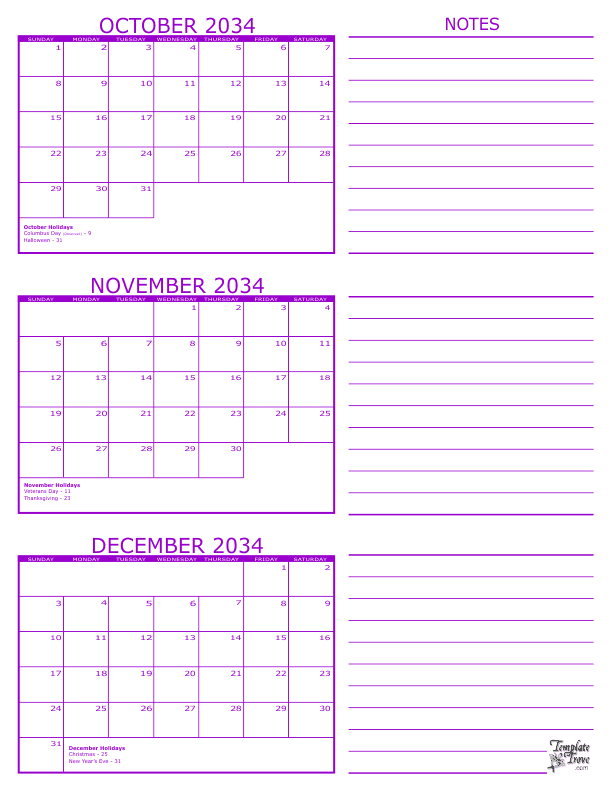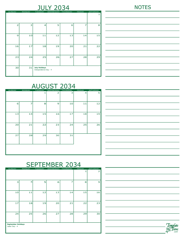 3 month calendars are available in PDF format. Five colors to choose from and can be printed on standard letter size paper (8 1/2" x 11"). 3 calendar months on each page with a notes section for each month.