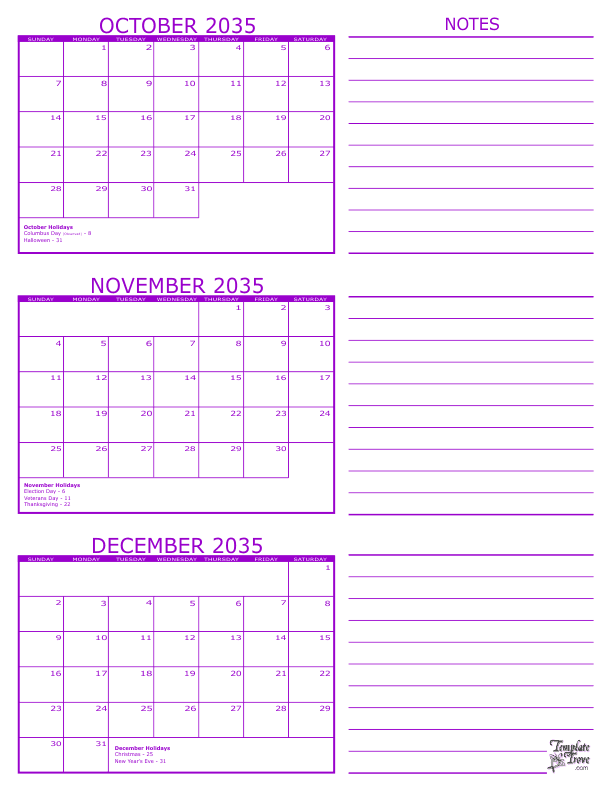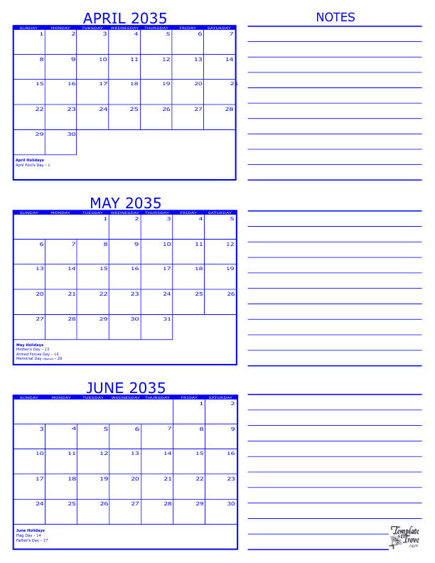 3 month calendars are available in PDF format. Five colors to choose from and can be printed on standard letter size paper (8 1/2" x 11"). 3 calendar months on each page with a notes section for each month.