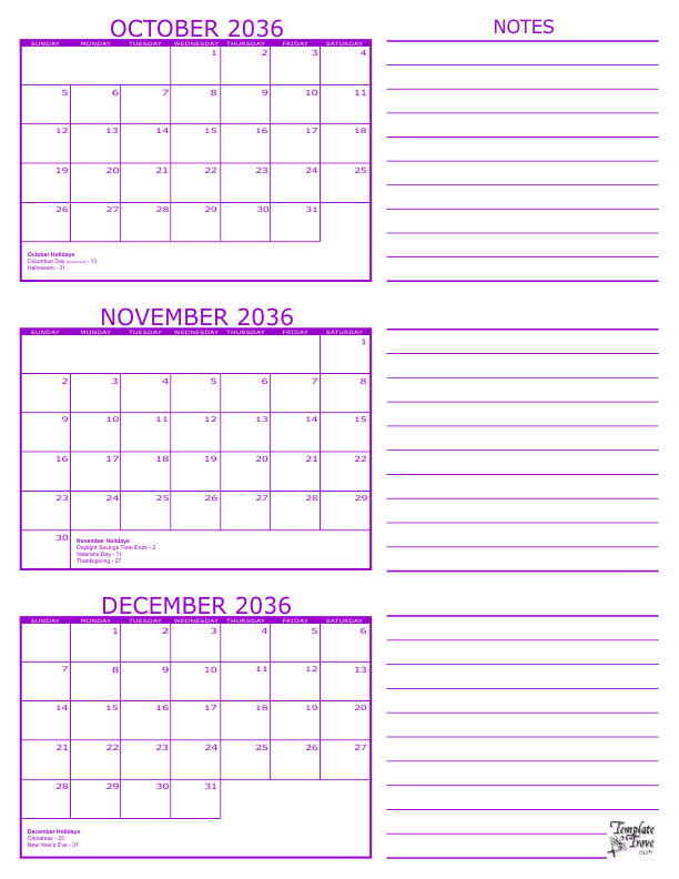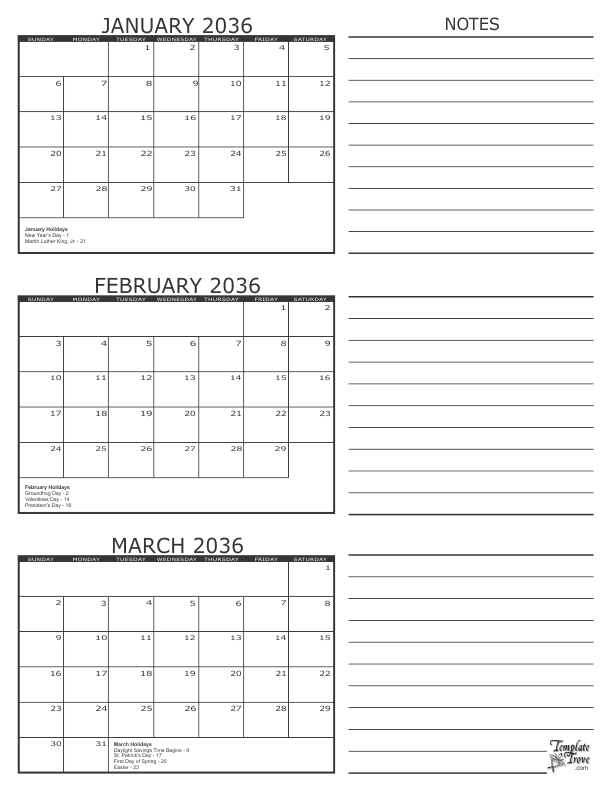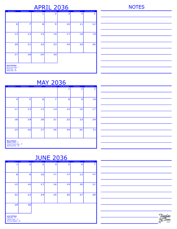 3 month calendars are available in PDF format. Five colors to choose from and can be printed on standard letter size paper (8 1/2" x 11"). 3 calendar months on each page with a notes section for each month.