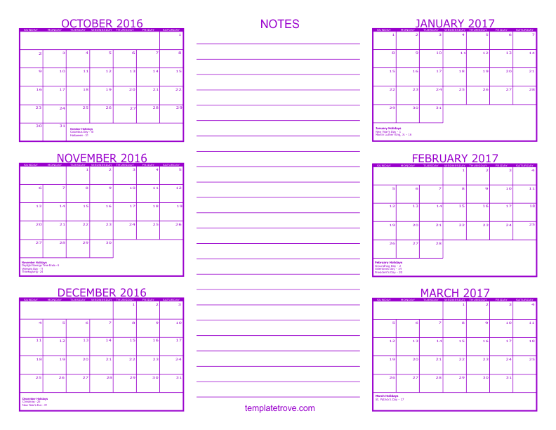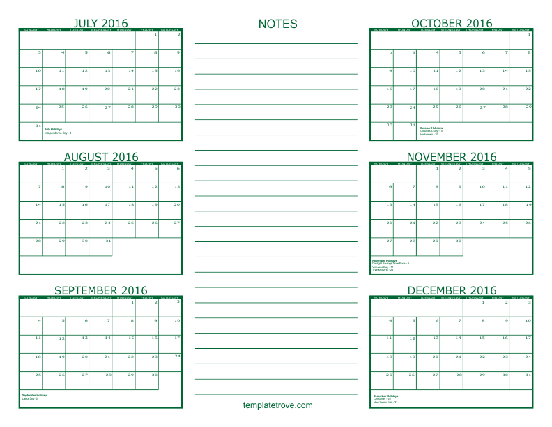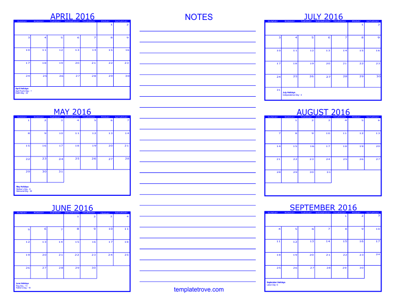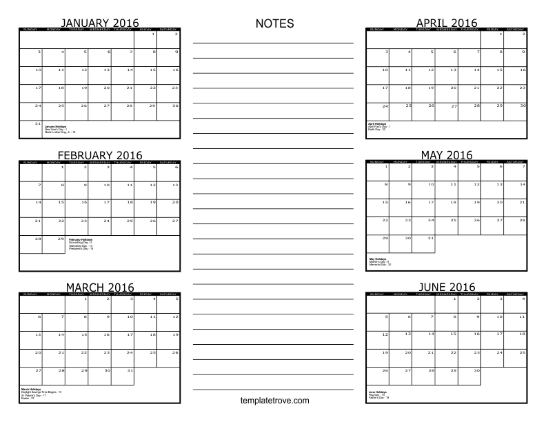 2016 6 Month Calendars