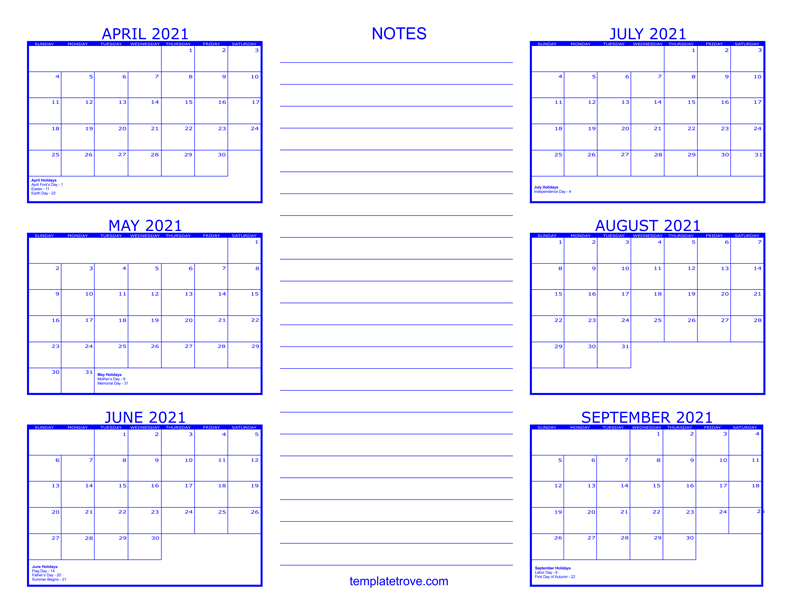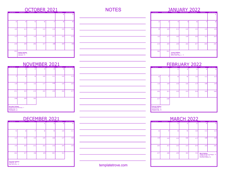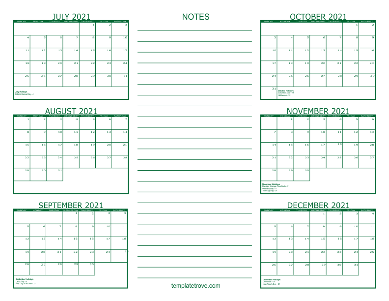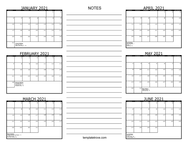 Our 6 month calendars have six calendar months per page with 12 available combinations of months. All calendars are in PDF format and are available in five colors. Calendars are formatted to fit standard letter size paper (8 1/2" x 11").