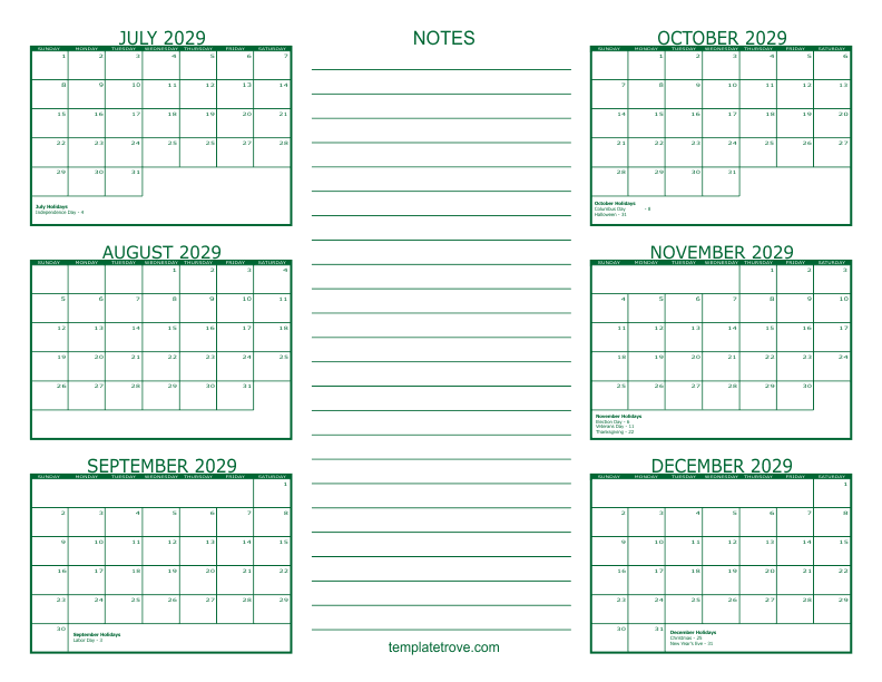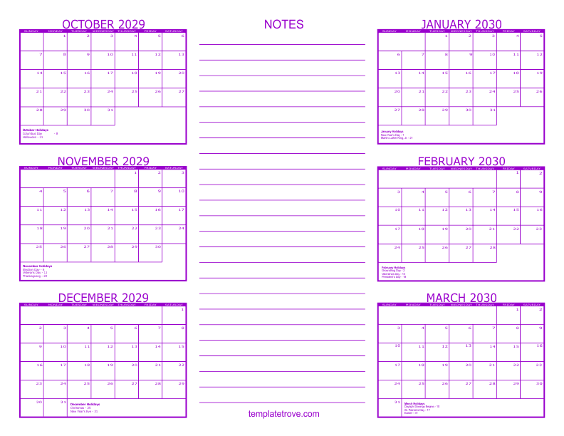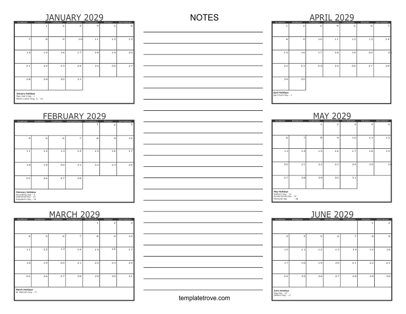 2029 6 Month Calendars