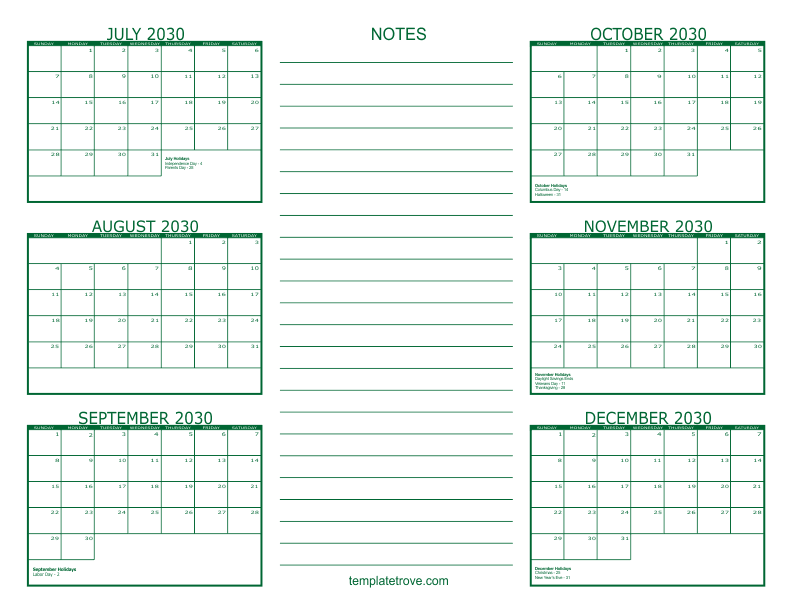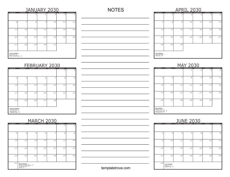 Our 6 month calendars have six calendar months per page with 12 available combinations of months. All calendars are in PDF format and are available in five colors. Calendars are formatted to fit standard letter size paper (8 1/2" x 11").
