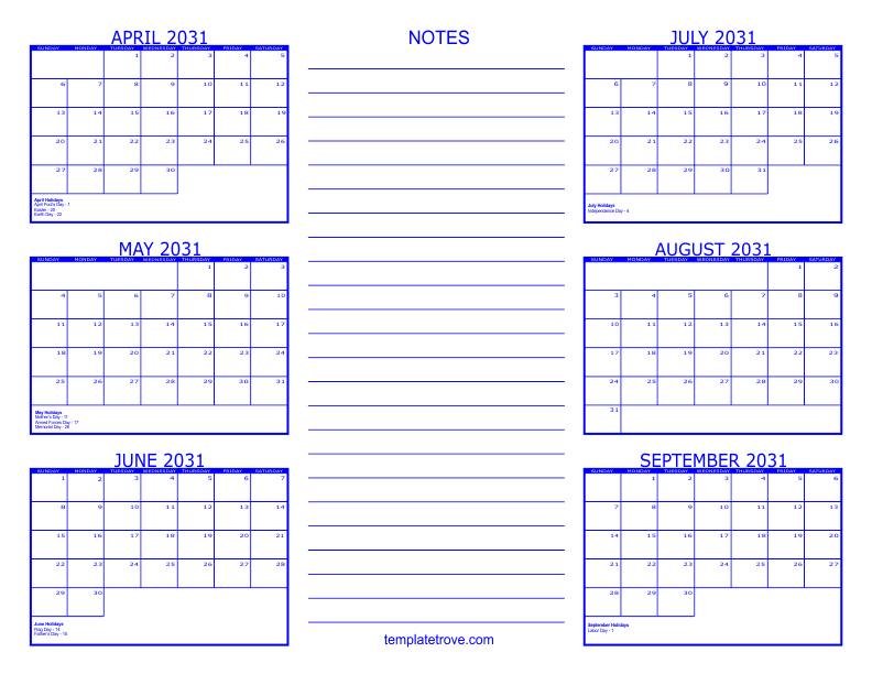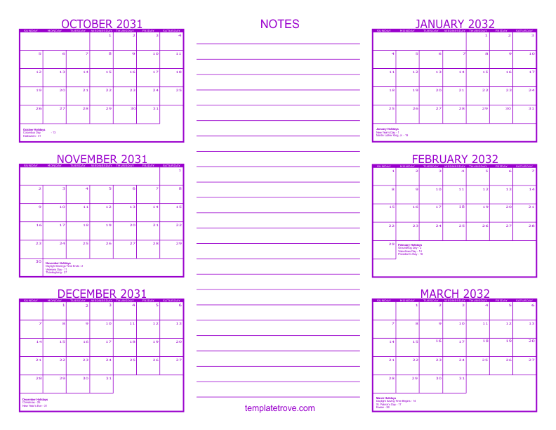 Our 6 month calendars have six calendar months per page with 12 available combinations of months. All calendars are in PDF format and are available in five colors. Calendars are formatted to fit standard letter size paper (8 1/2" x 11").