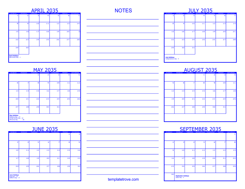 2035 6 Month Calendar