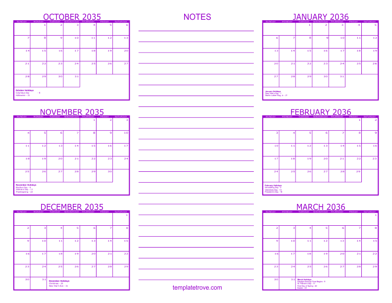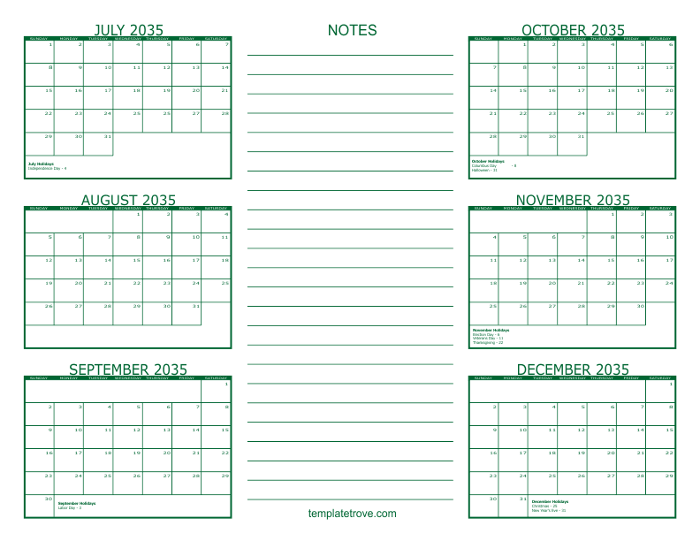 2035 6 Month Calendars