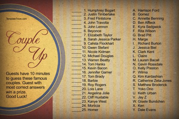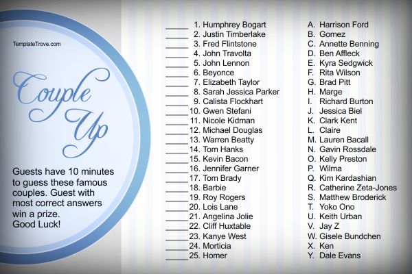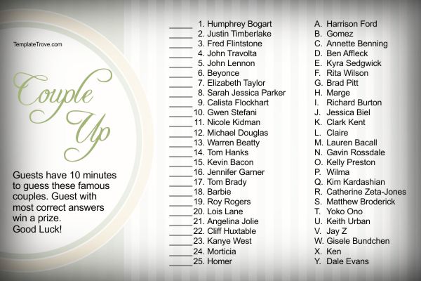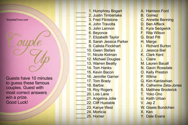 This bridal shower game available in PDF format. Prints 2-up on standard 8 1/2" x 11" letter size paper. Answer keys are included in PDF.