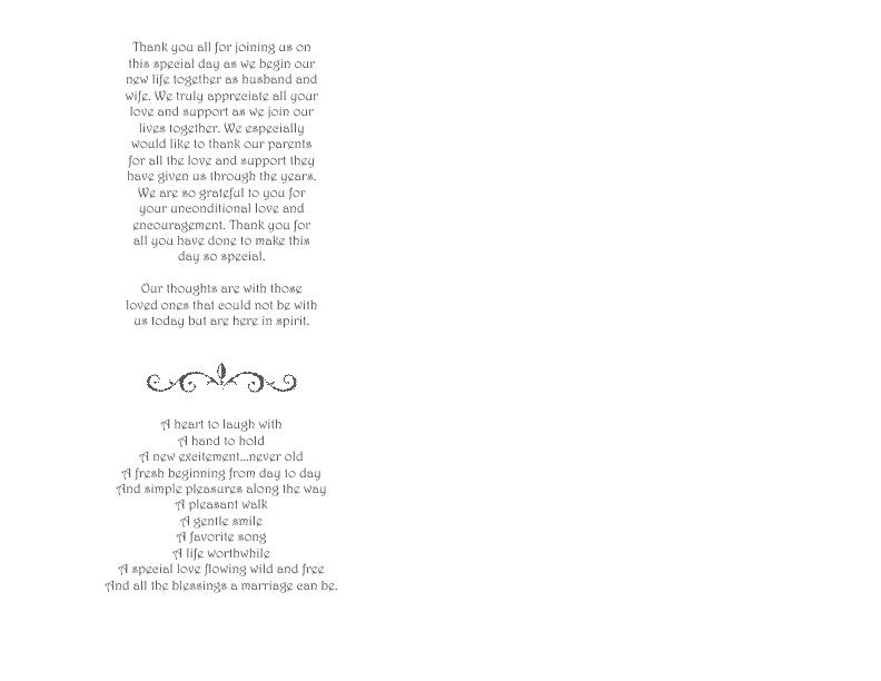Template 1 - Back (blank right side of sheet is where the pre-printed wedding cover graphic would be shown). You can see and example of this type of paper at end of this page.