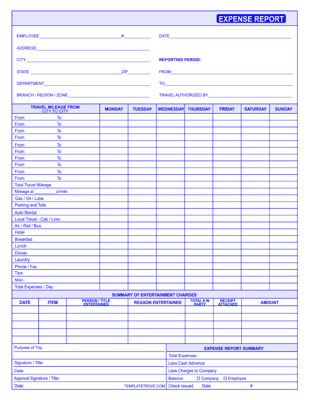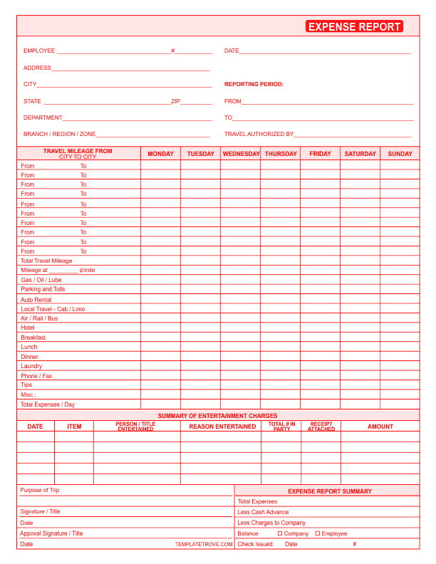 Expense report forms available in Corel Draw, InDesign, Publisher, PDF and Word formats and are available in five colors.