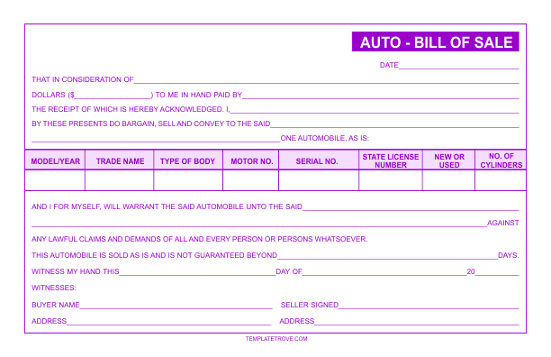 This auto bill of sale template can be downloaded and edited in Word, Publisher, InDesign and Corel Draw formats. Prints 2-up on letter size paper.