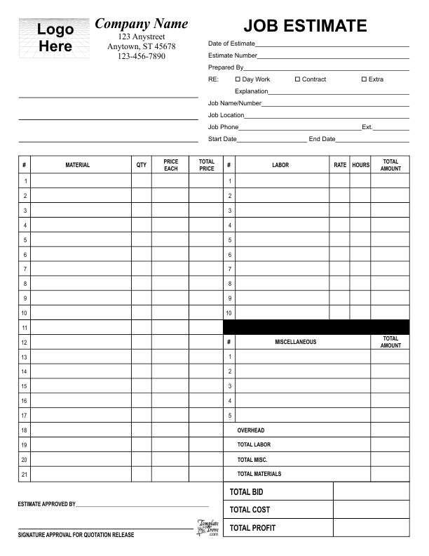 Add your company information and logo if desired then complete your job estimate by writing your information. Download in Word, Corel Draw and InDesign formats. Prints on 8 1/2" x 11" paper.