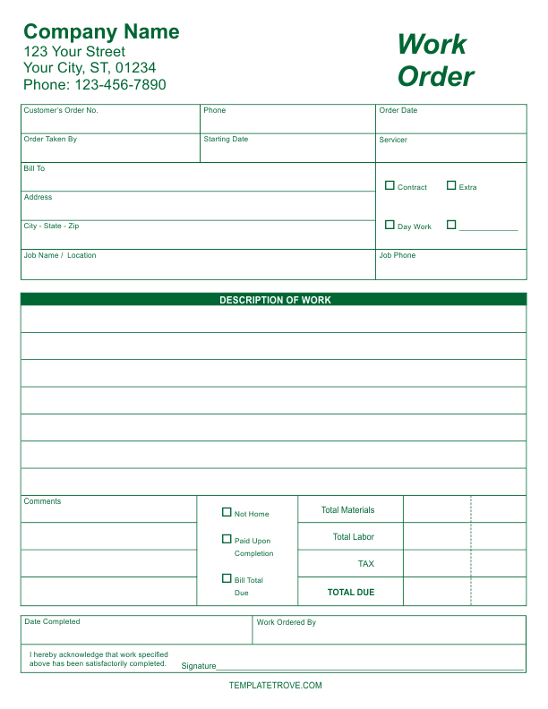 Work order templates in two sizes: statement size - 5 1/2" x 8 1/2" (prints 2 up) and letter size. Select from five colors, simpy add your business info, print and then write out your order.