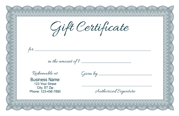 Simple, formal gift certificate template - Available in Corel, InDesign, Publisher and Word formats. Prints on standard letter-size stock.