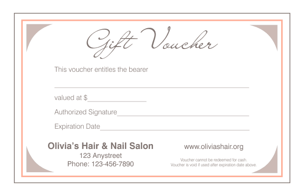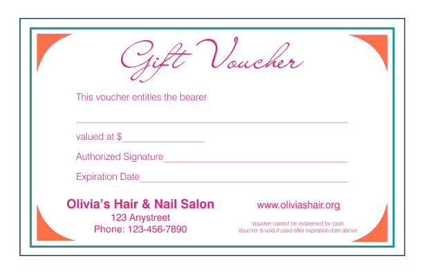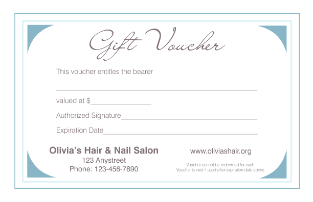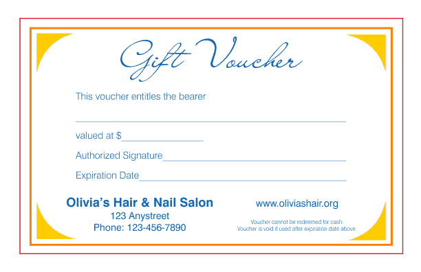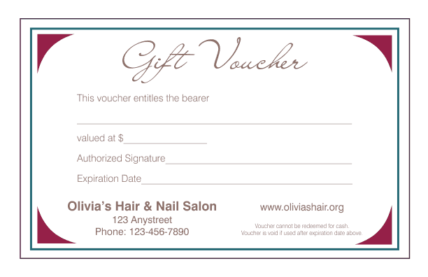 Gift Voucher templates are available in Word, Corel Draw, Publisher and InDesign formats in several colors and styles. The template is set up to print 2 up on standard 8 1/2" x 11" letter size paper.