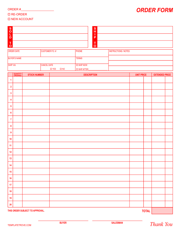 Order form templates are available in Corel Draw, Word, Publisher, PDF and InDesign formats in several colors and styles. The templates print one-up on standard letter size stock.