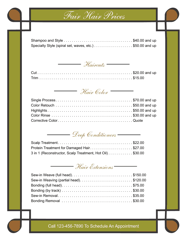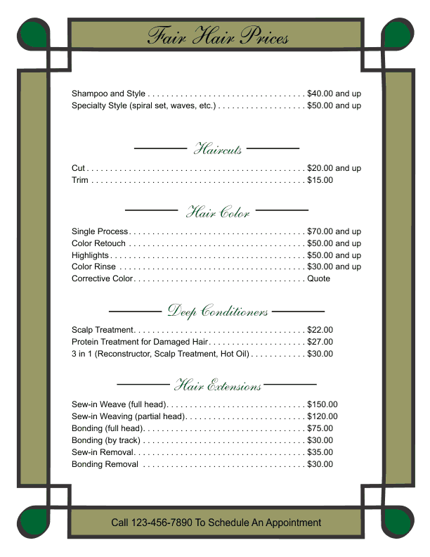 This two color template is designed for a beauty salon and contains sections for haircuts, colors, hair extensions and other services.