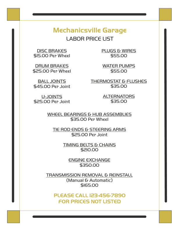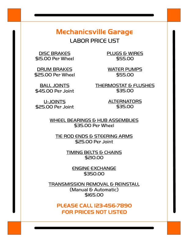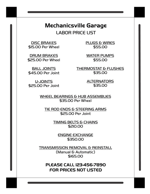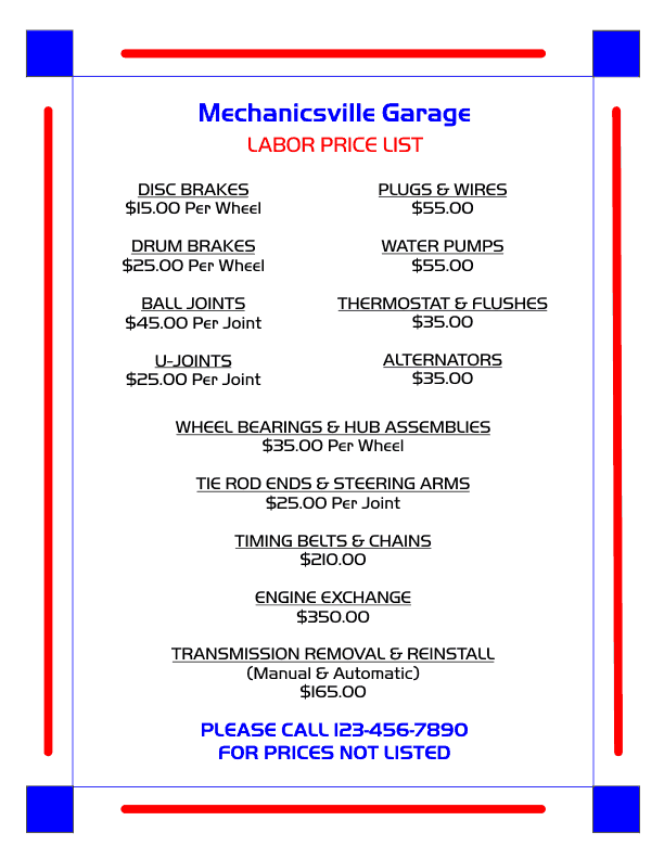 This template also prints on standard 8 1/2" x 11" letter size paper with four color schemes. It is designed for a mechanic or garage but can be adapted for any type of business or service. Great for listing prices for specific services.