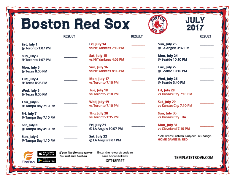 July 2017 Boston Red Sox Schedule