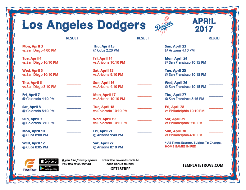 April 2017 Dodgers Schedule