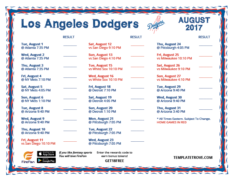 August 2017 Dodgers Schedule