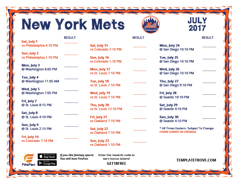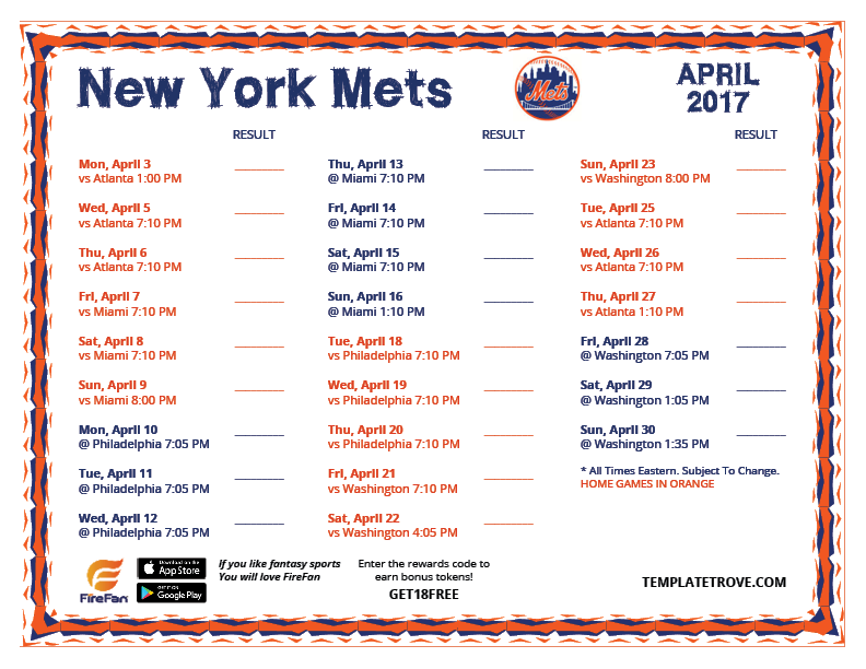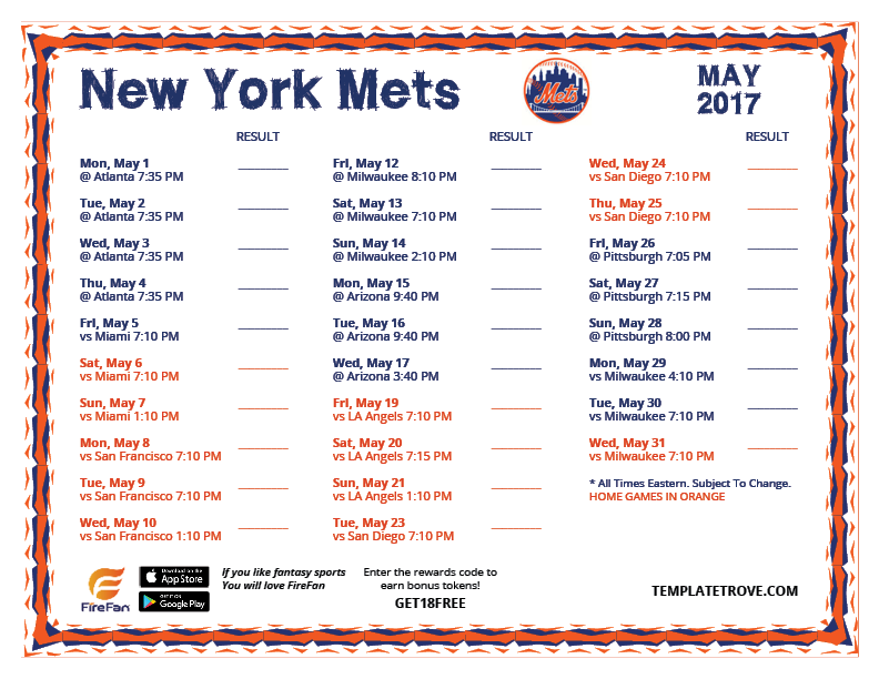 Keep up with the 2017 New York Mets with our handy printable schedules.