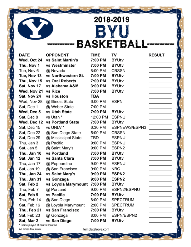 Printable 2018-19 BYU Cougars Basketball Schedule