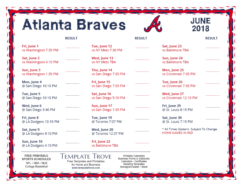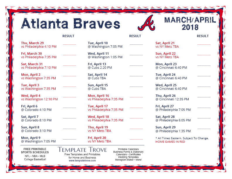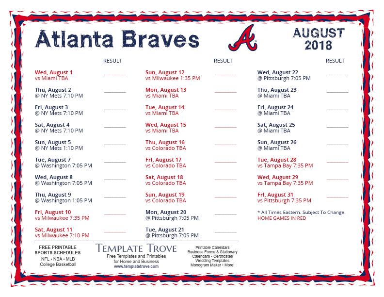 Keep up with the 2018 Atlanta Braves with our handy printable schedules, now available for each US time zone.