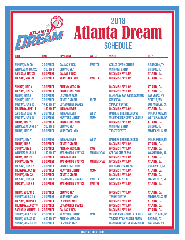 Keep up with the Atlanta Dream basketball team in the 2018 season with our free printable regular season schedules.Schedules print on 8 1/2" x 11" paper. Click thumbnails of schedules to enlarge.