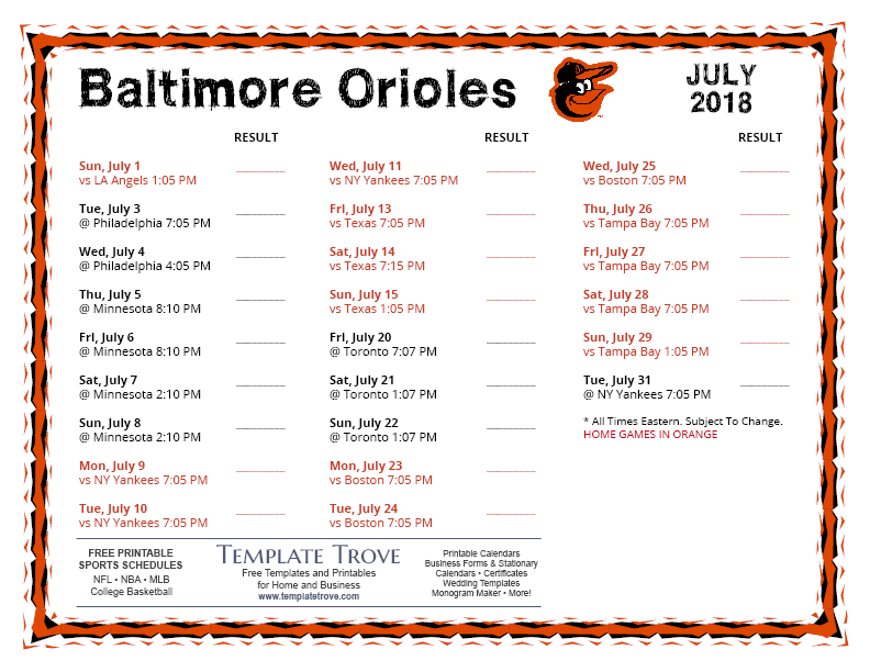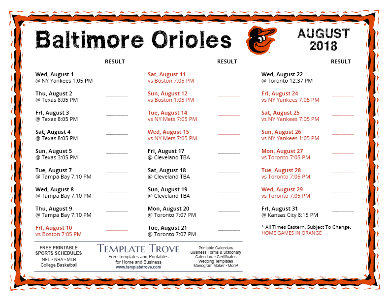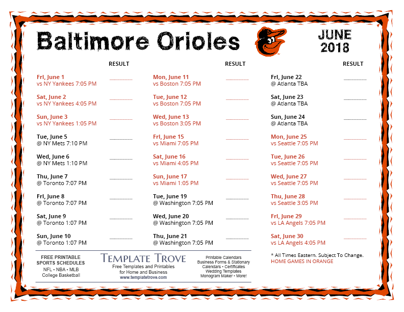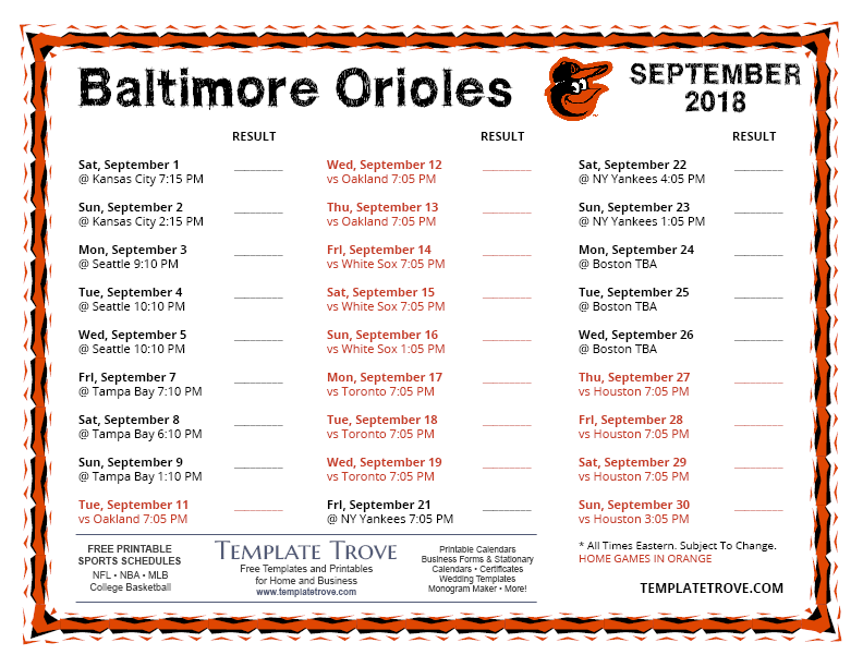Keep up with the 2018 Baltimore Orioles with our handy printable schedules, now available for each US time zone.