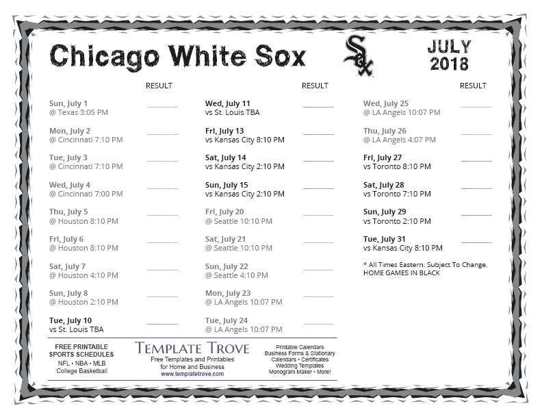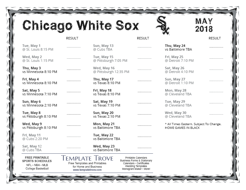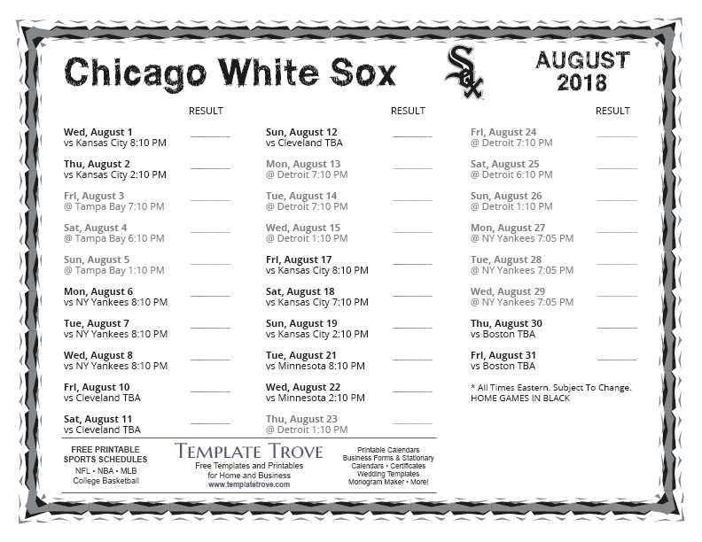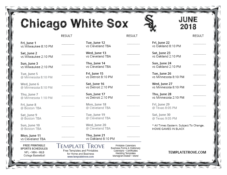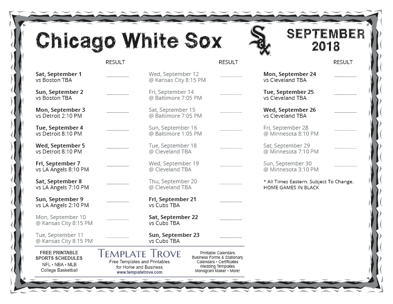 Keep up with the 2018 Chicago White Sox with our handy printable schedules, now available for each US time zone.