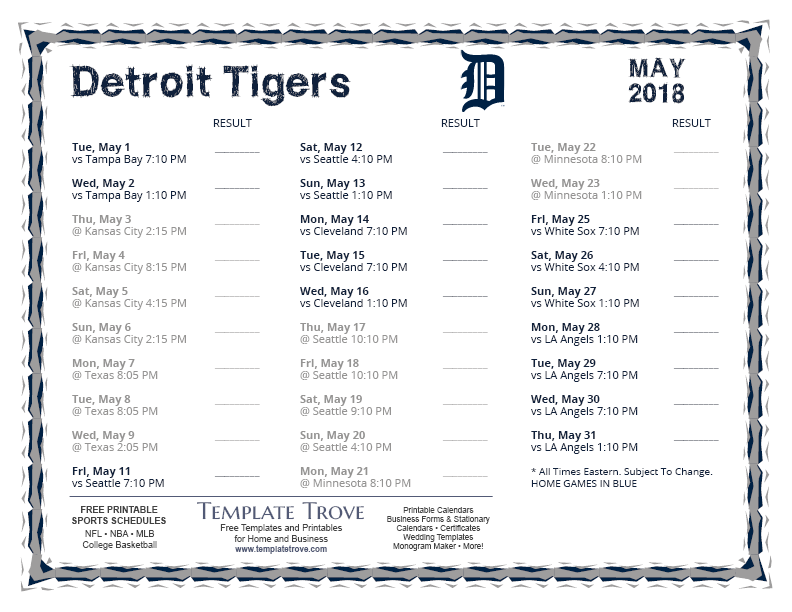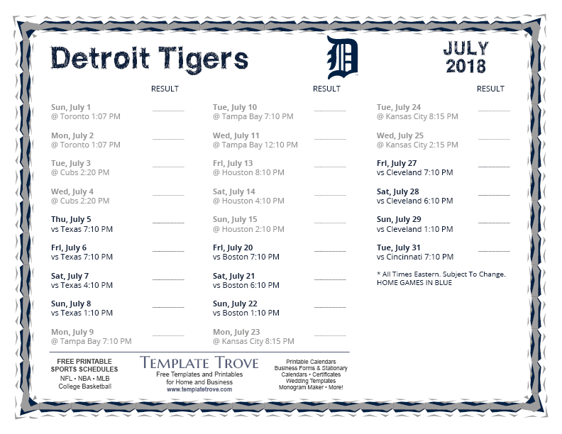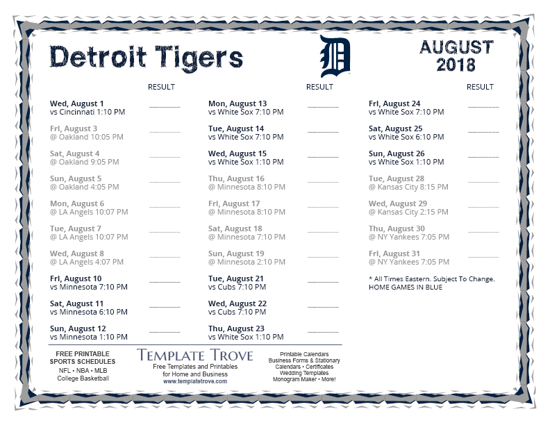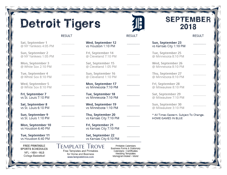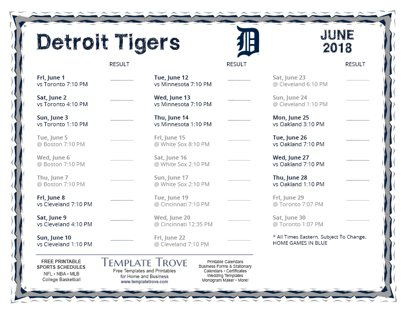 Keep up with the 2018 Detroit Tigers with our handy printable schedules, now available for each US time zone.
