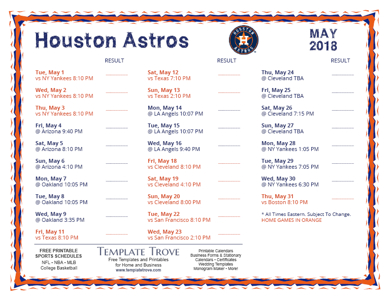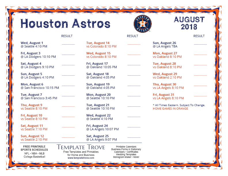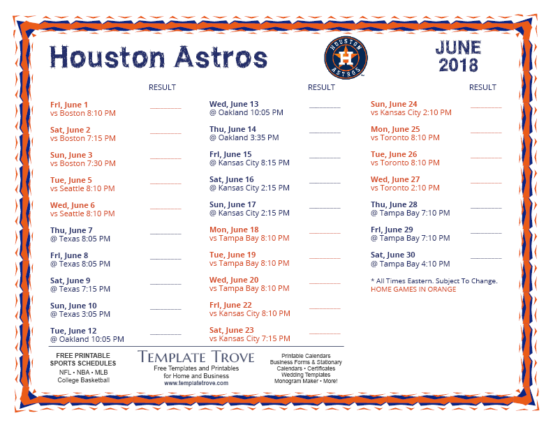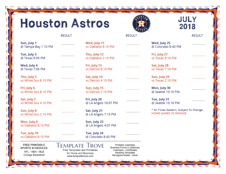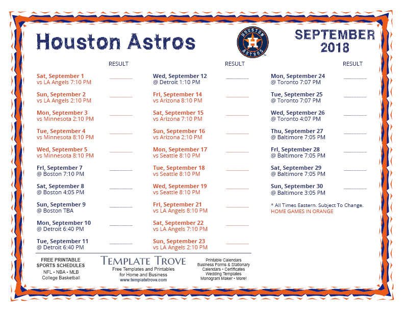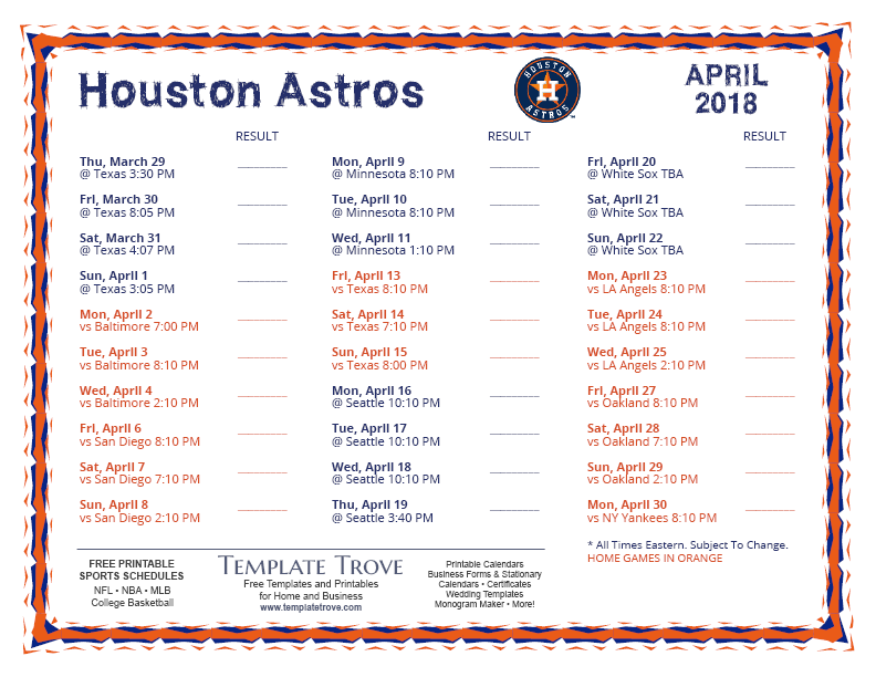 Keep up with the 2018 Houston Astros with our handy printable schedules, now available for each US time zone.