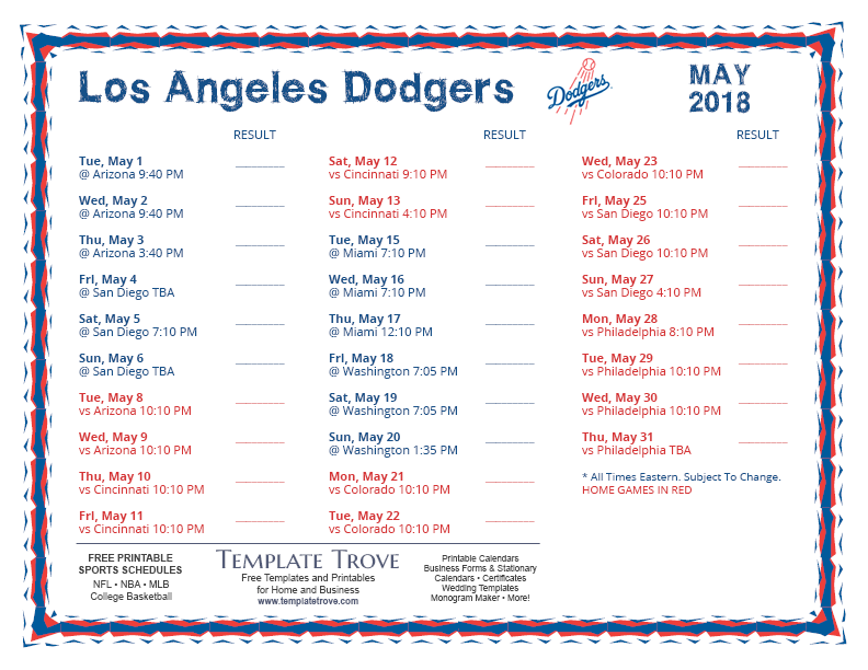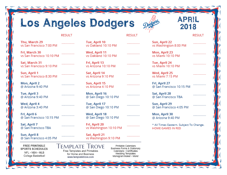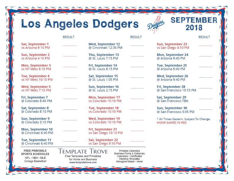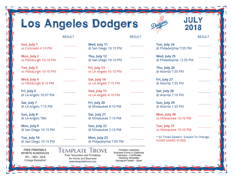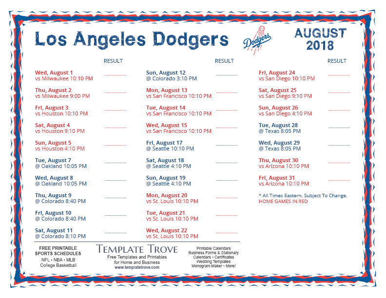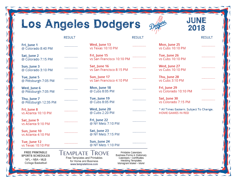 Keep up with the 2018 Los Angeles Dodgers with our handy printable schedules, now available for each US time zone.