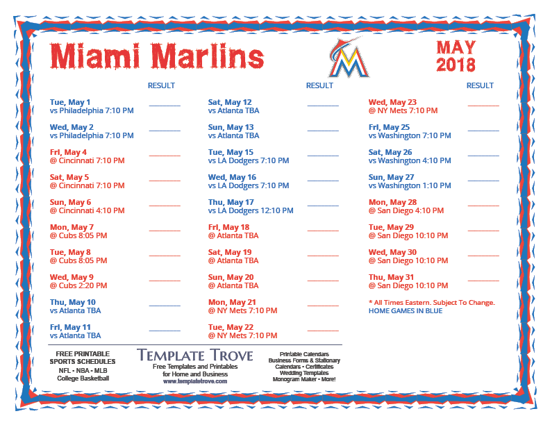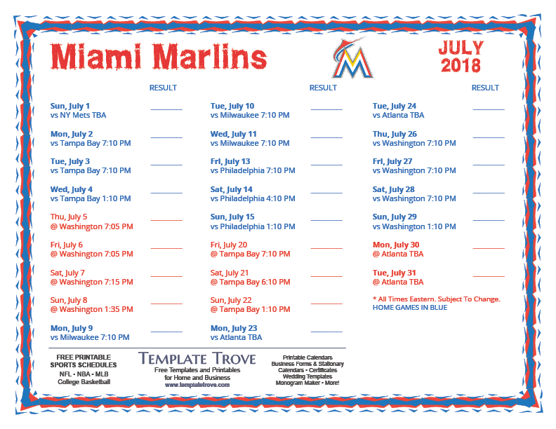 Keep up with the 2018 Miami Marlins with our handy printable schedules, now available for each US time zone.